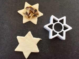 *** Z ciasta francuskiego wycinamy za pomocą foremek kształty gwiazdek. Na środku gwiazdki układamy porcję pieczarek, brzegi smarujemy roztrzepanym jajkiem i przykrywamy drugą gwiazdką. Brzegi delikatnie sklejamy ***