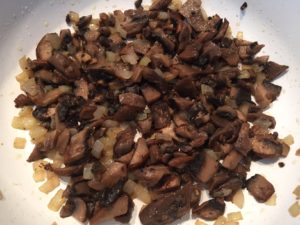 *** Pieczarki myjemy i kroimy w kosteczkę. Na patelni na łyżce oleju szklimy drobno posiekaną cebulę, następnie dodajemy pieczarki i wszystko razem smażymy kilka minut – do odparowania wody. Dokładamy masło oraz przeciśnięty czosnek i doprawiamy do smaku solą i pieprzem, Jeszcze chwilę dusimy, po czym odstawiamy do ostygnięcia ***