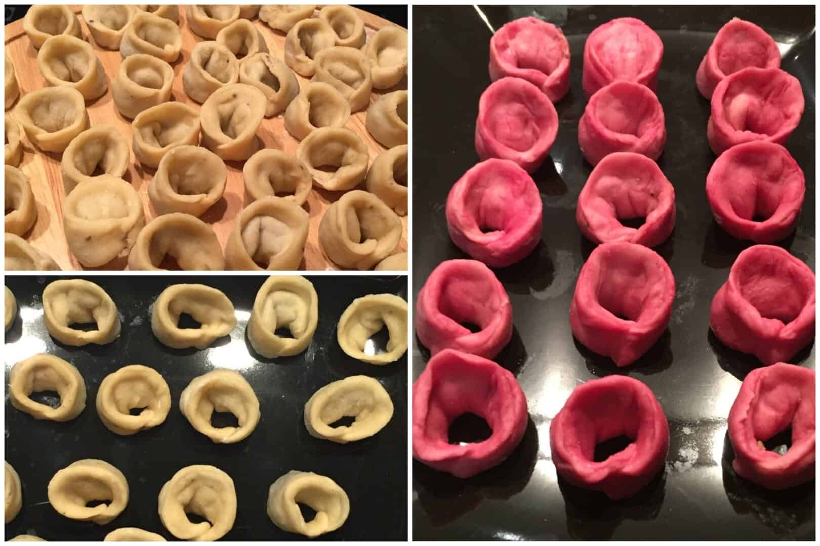Jeżeli chcemy uzyskać różowe, buraczane uszka, wodę w składnikach na ciasto zamieniamy na sok z buraka. Dalej postępujemy tak samo jak przy zwykłych pierożkach.