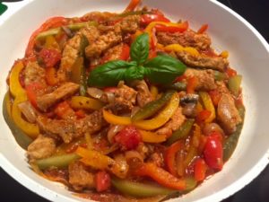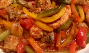 Pyszna propozycja obiadowa. Schab w sosie pomidorowym z dodatkiem papryki i pieczarek. Potrawa jest bardzo smaczna i trochę przypomina leczo, jednak zamiast kiełbasy jest w niej mięso wieprzowe. Danie można podać z ryżem, kaszą lub duszonymi ziemniaczkami.