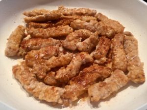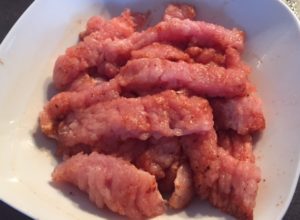*** Schab kroimy w plastry a następnie w paseczki i doprawiamy solą, pieprzem, papryką mieloną oraz majerankiem ***