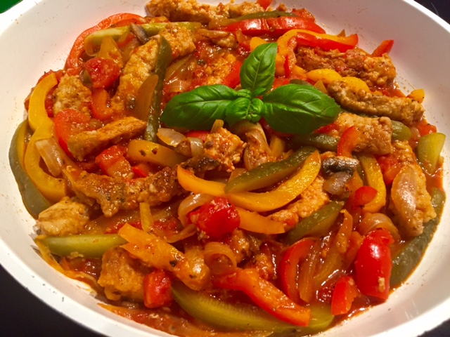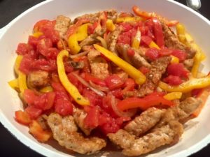 *** Papryki kroimy w paseczki i dokładamy na patelnie. Wszystko razem smażymy przez chwilę a następnie dodajemy pomidory z puszki ***