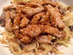 *** Mięso zdejmujemy z patelni. Cebulę kroimy w piórka i podsmażamy. Dodajemy pokrojone w plasterki pieczarki oraz przeciśnięty czosnek i wszystko smażymy na dużym ogniu aby nadmiar wody odparował. Następnie wrzucamy na patelnie odłożone wcześniej mięso  ***