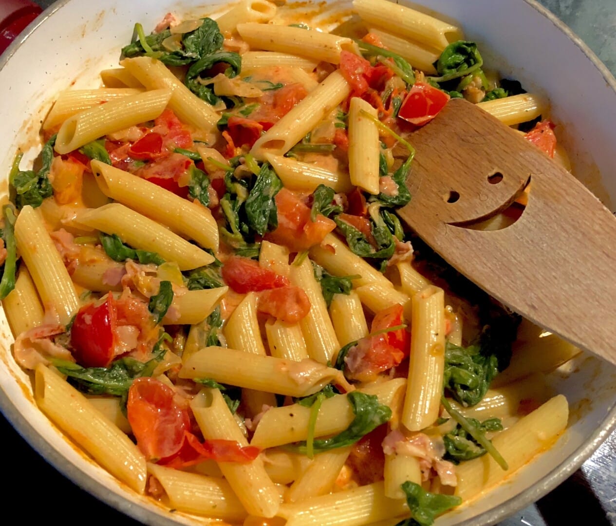 Pomysł na szybki, sycący i bardzo smaczny obiad z makaronem, wędzonym boczkiem, szpinakiem i pomidorami. Idealnie danie na ciepłe, leniwe popołudnie 🙂