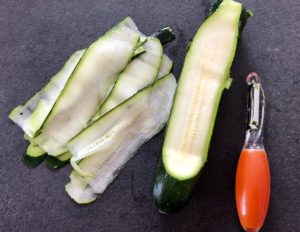 *** Cukinie kroimy wzdłuż na cieniutkie paseczki – najlepiej zrobić to za pomocą obieraczki do warzyw lub krajalnicy ***