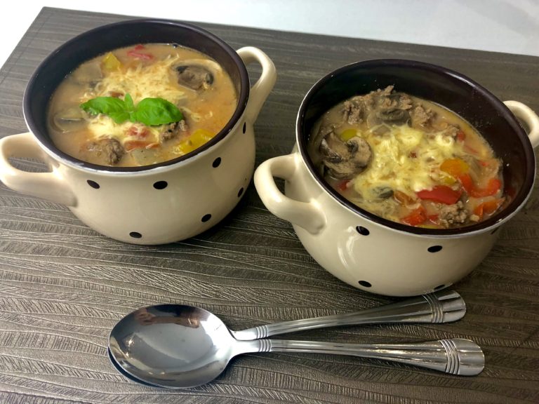 Naprawdę pyszna i rozgrzewająca zupa przygotowana na bazie pieczarek, pomidorów, papryki oraz mielonego mięsa i zagęszczona śmietankowym serkiem topionym. Zupa pizza to idealna propozycja dla wszystkich, którzy kochają intensywne, wyraziste smaki. To danie łączy w sobie to, co najlepsze w pizzy, z wygodą i sycącym charakterem domowej zupy. Aromatyczne przyprawy, mięso mielone, warzywa oraz kremowa konsystencja sprawiają, że trudno poprzestać na jednym talerzu.