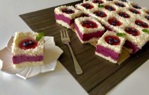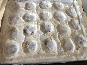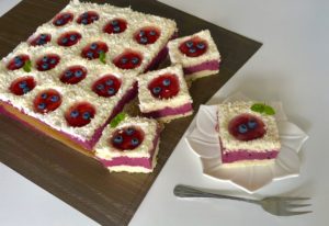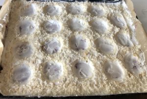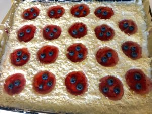*** Wierzch obsypujemy wiórkami kokosowymi omijając wykrojone części. Całość wkładamy do lodówki ***
