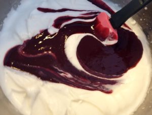 *** Schłodzoną śmietankę ubijamy na sztywno. Około 1 szklankę ubitej śmietanki odkładamy do posmarowania wierzchu ciasta. Do większej części ubitej śmietanki dodajemy pomału mus z owoców, mieszamy ***