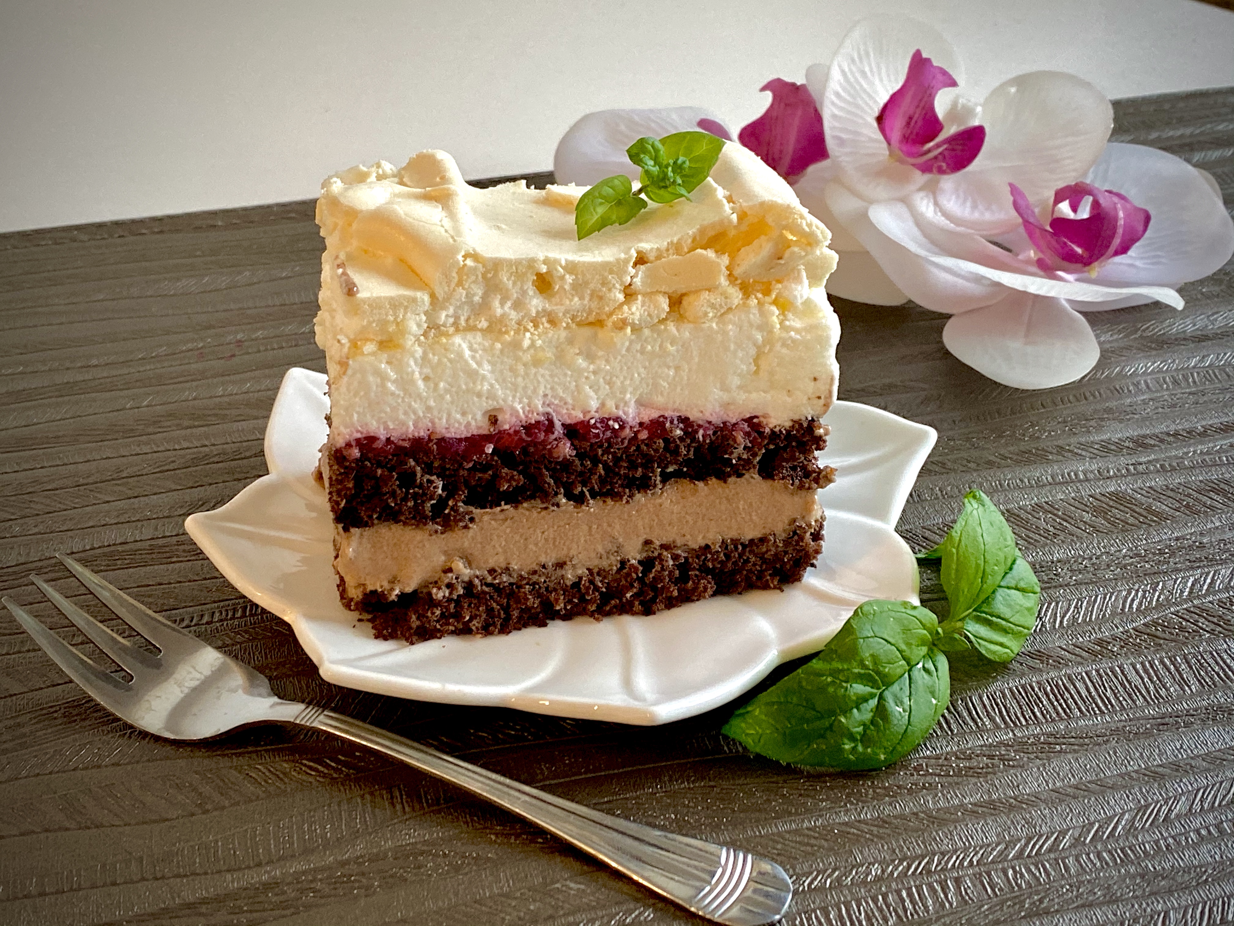 Efektowne i przepyszne ciasto na szczególne okazje. Czekoladowy biszkopt przełożony dwoma kremami- czekoladowym i śmietankowym oraz delikatnie kwaskową frużeliną malinową, a całość zwieńczona słodką i chrupiącą bezą. Niebo w ustach. Co prawda przygotowanie ciasta jest dość pracochłonne ale efekt WOOOW (zarówno wizualny jak i smakowy) murowany. Polecam!