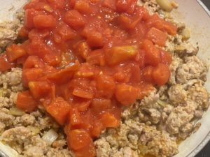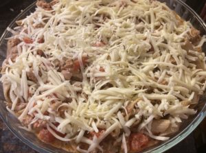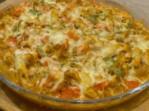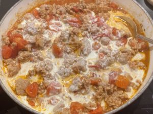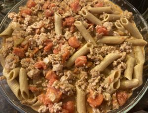 *** Ugotowany makaron oraz podsmażone mięso z pomidorami przekładamy do żaroodpornego naczynia i mieszamy razem ***