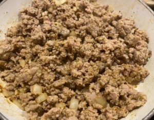 *** Na niewielkiej ilości rozgrzanego oleju podsmażamy mielone z pokrojoną w kostkę cebulką i czosnkiem. Smażymy do momentu, aż mięso straci surowy kolor. Dodajemy przyprawy: 1 łyżeczkę soli, szczyptę pieprzu i ostrej papryki, 1 łyżeczkę majeranku oraz słodkiej papryki. Mieszamy ***