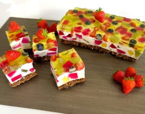 *** W międzyczasie przygotowujemy kolejną galaretkę (najlepiej w jasnym lub bezbarwnym kolorze), którą rozpuszczamy w wodzie według przepisu na opakowaniu. Na wierzchu ciasta układamy pozostałe kostki galaretki oraz pokrojone na kawałki świeże owoce ***