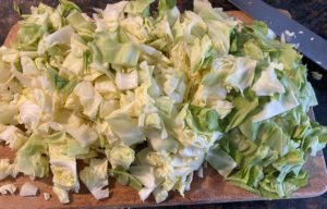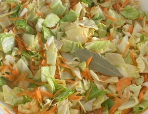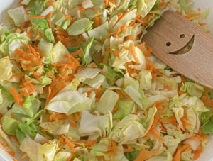 *** Mięso zdejmujemy z patelni. Na tym samym tłuszczu lekko podsmażamy cebulkę, następnie dodajemy startą marchew i kapustę, całość jeszcze przez chwilę podsmażamy ***