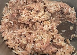 *** Do mielonego mięsa dodajemy jajko, ugotowany ryż,  bułkę tartą oraz przyprawy- do smaku. Całość dokładnie mieszamy ***