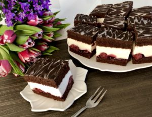 Bardzo efektowne i mega smaczne ciasto czekoladowe przełożone frużeliną wiśniową oraz kremową masą śmietankową i oblane polewą czekoladową. Niebo w ustach!