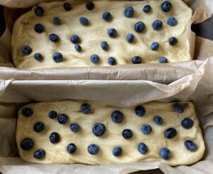 *** Po tym czasie ciasto jeszcze przez chwilę zagniatamy i przekładamy do dużej foremki wyłożonej papierem do pieczenia lub dzielimy na pół i wkładamy do dwóch keksówek (ja wolę piec ciasto drożdżowe w keksówkach, gdyż wtedy wychodzi wyższe i bardziej wilgotne – piekę wówczas oba ciasta na raz). Na wierzchu wykładamy borówki. Całość znowu przykrywamy ściereczką i odkładamy do ponownego wyrośnięcia na około 20 minut.  ***