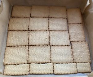 *** Blaszkę o wymiarach 26x26cm wykładamy papierem do pieczenia. Na dnie układamy spód z namoczonych w mleku herbatników ***