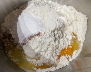 *** Do miski wsypujemy mąkę, proszek do pieczenia, przyprawę do piernika oraz cukier. Wbijamy jajka i dodajemy masło oraz miód ***