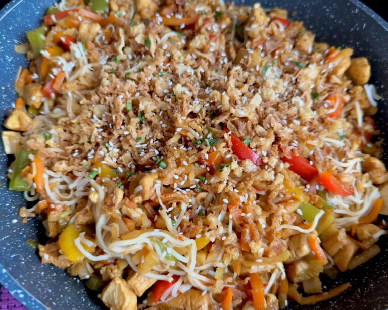 Prosty i pyszny makaron z kurczakiem w klimacie kuchni chińskiej, którego wykonania zajmuje zaledwie kilka minut.