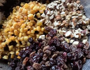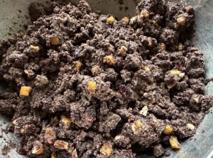 *** Dodajemy wszystkie bakalie: posiekane orzechy, skórkę pomarańczową, rodzynki i żurawinę ***