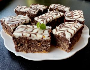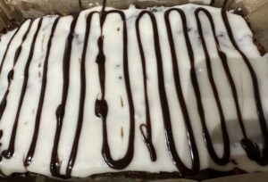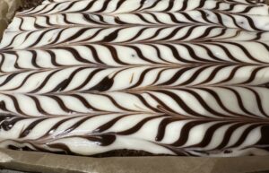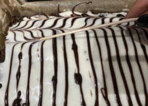 *** Ciasto polewamy równomiernie lukrem. Roztopioną czekoladę przekładamy do woreczka, odcinamy końcówkę. Z czekolady robimy poprzeczne paseczki na cieście. Całą operacje musimy wykonać dość szybko, aby lukier nie zdążył zastygnąć ***