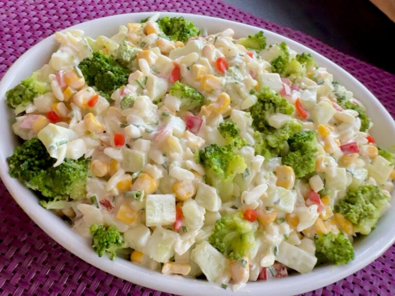 Pyszna sałatka makaronowa z serem i warzywami, która będzie także świetnym dodatkiem do obiadu lub grilla. Nie zawiera mięsa, choć nic nie stoi na przeszkodzie, żeby dodać do niej ulubioną szynkę lub inną wędlinę. Jeśli planujecie zrobić na obiad smażone lub grillowane mięsko albo rybkę, to ta sałatka będzie świetnym dopełnieniem takiego dania. Polecam!