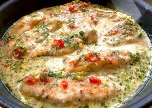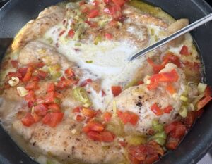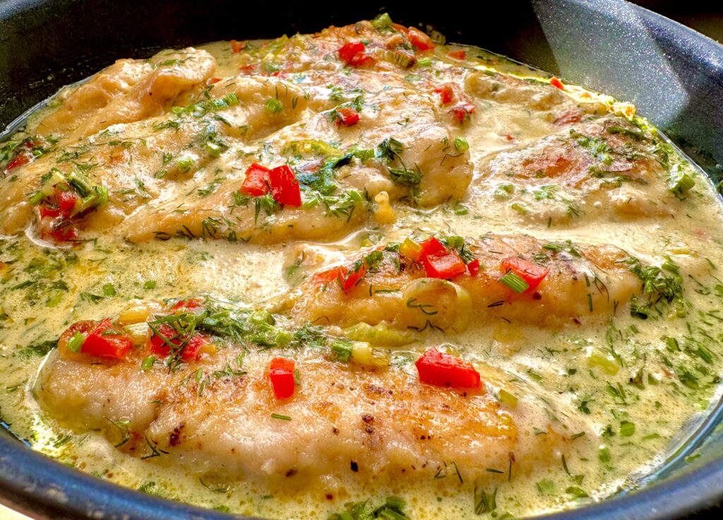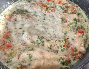 Kruche i soczyste mięso z kurczaka duszone w pysznym, kremowym sosie z warzywami i koperkiem. Świetne danie obiadowe, które możemy podać z ziemniaczkami lub ryżem. Polecam!