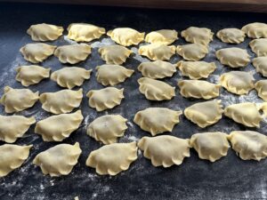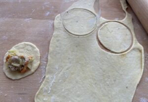*** Kółka składamy na pół i zaklejamy brzegi. Sklejone pierożki układamy na podsypanym mąką blacie lub deseczce ***