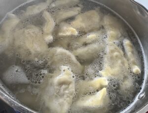 *** W dużym garnku zagotowujemy wodę z łyżeczką soli oraz łyżką oliwy i partiami wrzucamy pierogi. Każdą porcję pierogów gotujemy dwie minuty od momentu wypłynięcia ***