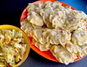 Te domowe pierogi są naprawdę pyszne, a zrobicie je wykorzystując mięso, które zostało Wam z obiadu (może być gotowane, pieczone lub smażone). Do farszu dodajemy także rewelacyjną potrawkę z młodej kapusty. Przed podaniem pierożki możemy posypać zeszkloną cebulką podsmażoną z wędzonym boczkiem. Palce lizać.