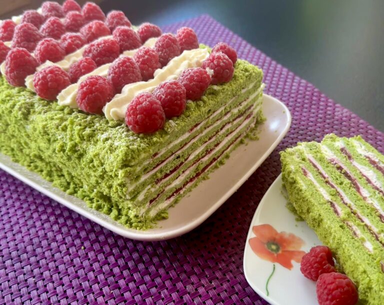 Smaczne i efektowne ciasto warstwowe, złożone z miodowych blatów, kremu śmietankowego i musu malinowego. Coś pysznego!