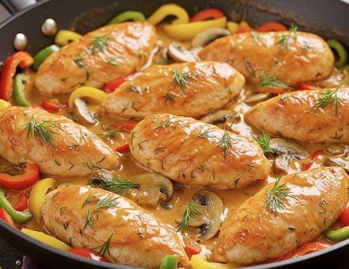 Maślane fileciki z kurczaka w kremowym sosie z papryką i pieczarkami