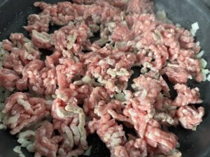 *** Gdy cebula się zeszkli dodajemy drobno posiekany lub przeciśnięty czosnek, mieszamy i dodajemy mięso mielone ***