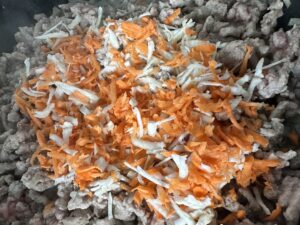 *** Gdy mięso straci surowy dodajemy starte na tarce warzywa: marchew, pietruszkę i seler ***
