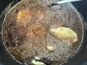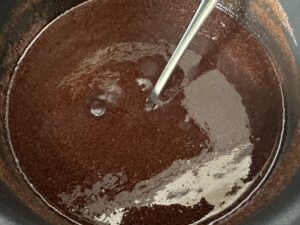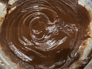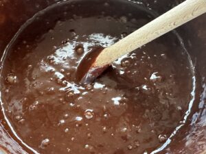 Do małego garnka przekładamy połamaną na kawałki czekoladę, dodajemy masło i wlewamy sok. Całość delikatnie podgrzewamy ciągle mieszając, aż składniki się roztopią