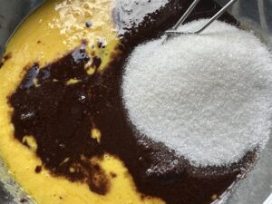 Dokładnie mieszamy. Dodajemy masę czekoladową oraz cukier