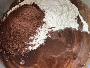 Mieszamy. Wsypujemy mąkę, kakao, sól, sodę i proszek do pieczenia