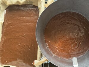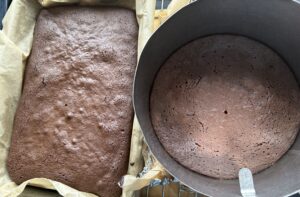 Dno blaszek wykładamy papierem do pieczenia (moja tortownica o średnicy 18 cm i mała prostokątna blaszka). Ciasto przelewamy do foremek