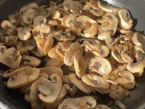 Podsmażone mięso przekładamy na talerz, a na tym samym tłuszczu podsmażamy pieczarki pokrojone w plasterki z drobno pokrojoną cebulą