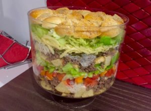 Rewelacyjna sałatka, która z pewnością stanie się hitem każdej imprezy. Jest bardzo efektowna i mega smaczna, wyglądem przypomina popularnego hamburgera. Idealna na spotkanie z przyjaciółmi, domową imprezkę czy nawet zwykłą kolacje w rodzinnym gronie.