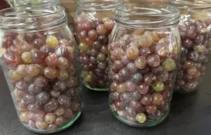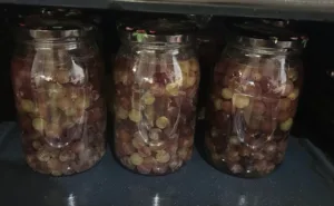 Uważnie zdejmujemy kulki winogron z kiści i wkładamy je do czystych słoików (należy zwrócić uwagę aby do słoików trafiały tylko „ładne” kulki, niedojrzałe i nadpsute winogrona wyrzucamy). Od góry słoika zostawiamy ok 2 centymetry wolnego miejsca.