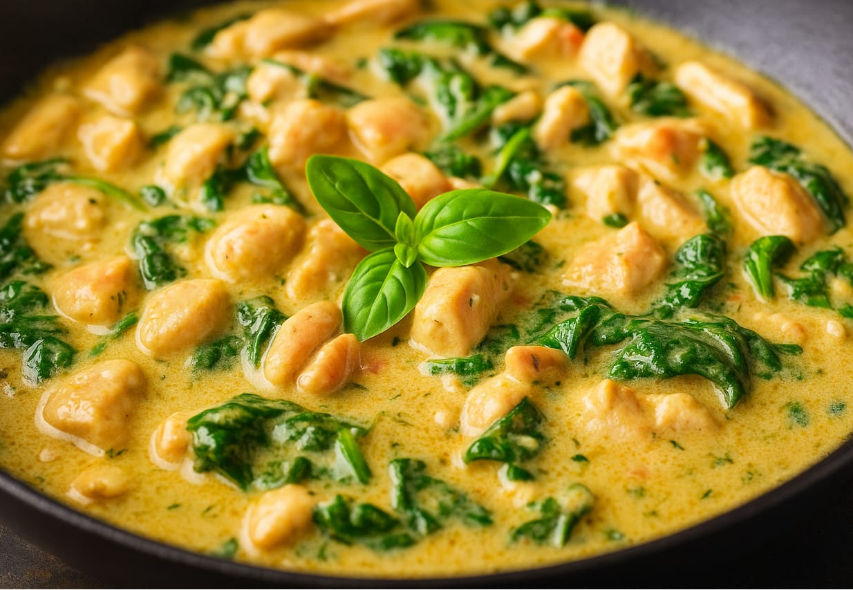 Kurczak ze szpinakiem w sosie serowym to danie, które łączy w sobie delikatność drobiu z kremową nutą sera i aromatycznym szpinakiem. Idealne na codzienny obiad, jak i na elegancką kolację. Mięso jest soczyste, a sos aksamitny i pełen smaku – doskonale komponuje się z ryżem, makaronem lub puree ziemniaczanym.