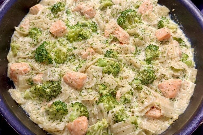 Miękkie kawałki łazanek idealnie oblepia aksamitny sos przygotowany z drobno rozdrobnionego brokuła, śmietanki i aromatycznych przypraw. Soczysty łosoś, lekko różowy i kruchy, dodaje potrawie szlachetności oraz subtelnej maślaności. Całość dopełnia nutka czosnku i koperku, które podkreślają świeżość i lekkość dania. To idealna propozycja na obiad lub kolację – domowa, rozgrzewająca, a jednocześnie elegancka i nowoczesna.