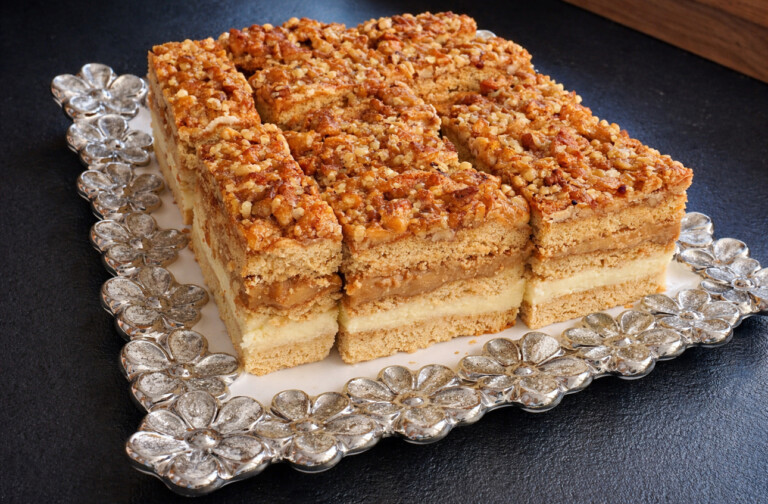 To ciasto to prawdziwa uczta dla miłośników tradycyjnych, domowych wypieków. Delikatne miodowe blaty przełożone aksamitnym kremem budyniowym, wzbogacone chrupiącymi orzechami i słodkim karmelem, tworzą deser idealnie zbalansowany – słodki, ale niezwykle wyrazisty.