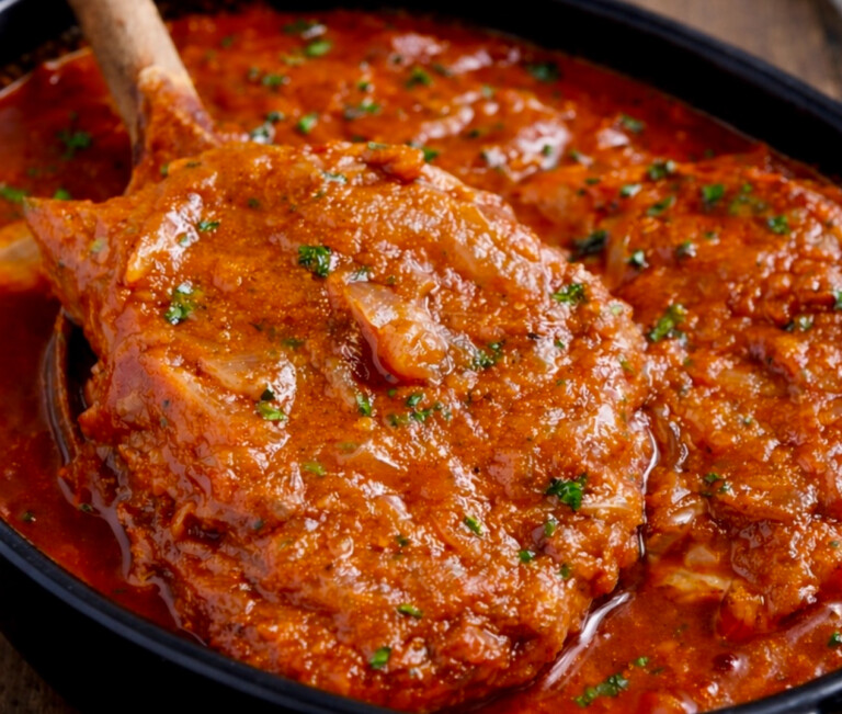Naczynie przykrywamy pokrywką lub folią aluminiową, wstawiamy do piekarnika nagrzanego do 180’C i pieczemy przez około 1,5 godziny, aż mięso będzie całkowicie miękkie. Ostatnie 15 minut pieczemy bez przykrycia. Przed podaniem danie posypujemy siekaną pietruszką.