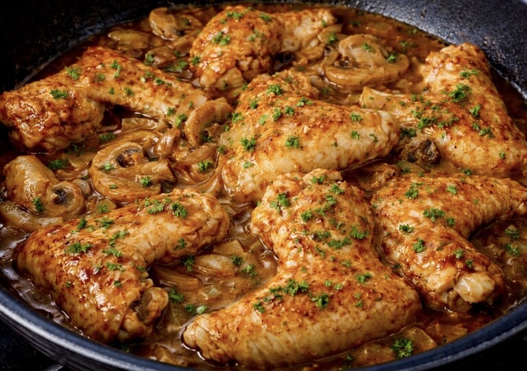 Skrzydełka w szklistym sosie pieczarkowym to prawdziwa uczta dla miłośników pysznych, domowych smaków. Miękkie, soczyste mięso idealnie łączy się z aksamitnym, delikatnie błyszczącym sosem na bazie pieczarek, który otula każdy kawałek aromatem podsmażanych grzybów i przypraw. To danie, które świetnie sprawdzi się zarówno na codzienny obiad, jak i na spotkanie przy wspólnym stole – sycące, rozgrzewające i niezwykle apetyczne. Podane z kaszą, ryżem lub świeżym pieczywem tworzą prostą, ale wyjątkowo smaczną kompozycję, do której chce się wracać.