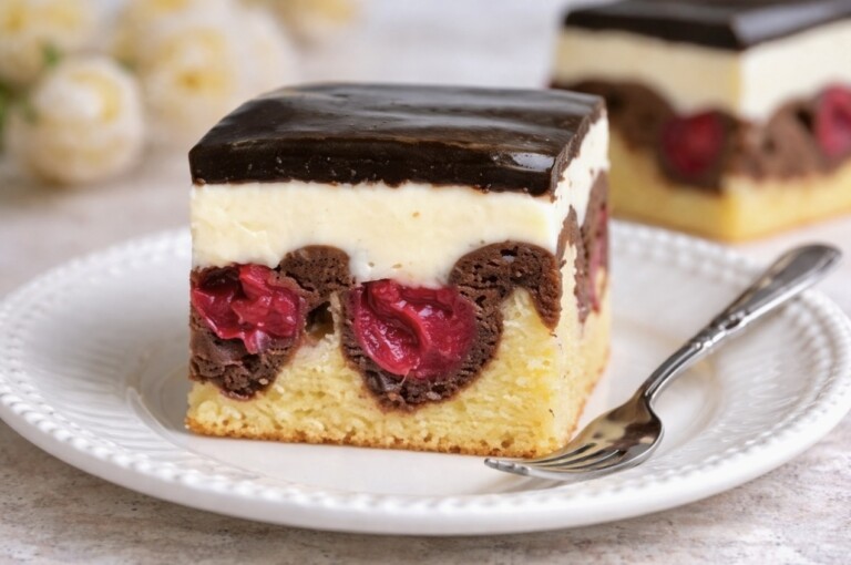 Puszyste, jasne i kakaowe ciasto tworzy charakterystyczne „fale”, między którymi kryją się soczyste, lekko kwaskowe wiśnie. Ich świeżość idealnie przełamuje słodycz wypieku i dodaje mu lekkości. Całość przekładana jest aksamitnym kremem karpatkowym – delikatnym, na bazie parzonego budyniu, który rozpływa się w ustach i nadaje deserowi wyjątkowej elegancji.
