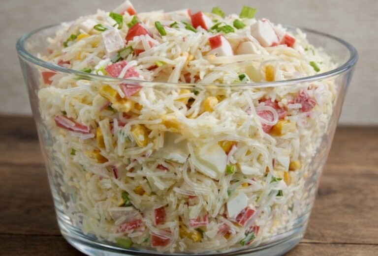 Sałatka z makaronem ryżowym i surimi to lekka, a jednocześnie sycąca propozycja idealna na każdą okazję. Delikatny makaron ryżowy świetnie łączy się z paluszkami surimi, tworząc bazę pełną subtelnego smaku. Całość dopełniają chrupiące dodatki i kremowy sos, który spaja składniki w harmonijną, bardzo przyjemną kompozycję. To sałatka szybka w przygotowaniu, kolorowa i świeża – doskonała na kolację, spotkanie z bliskimi czy jako efektowna propozycja na imprezowy stół. Lekka, uniwersalna i po prostu pyszna.