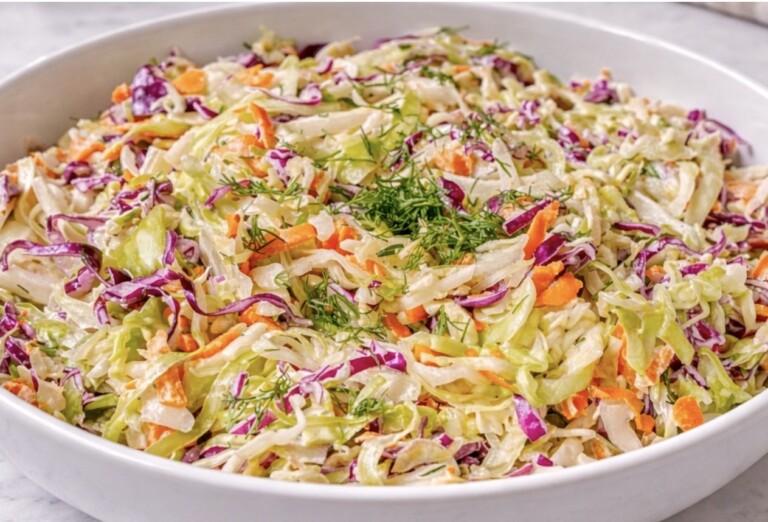 Cienko poszatkowana kapusta, uzupełniona startą marchewką, cebulą i odrobiną świeżego koperku, tworzy lekką, a jednocześnie wyrazistą kompozycję. Całość otula aksamitny sos na bazie majonezu i jogurtu, z dodatkiem soku z cytryny oraz miodu, który podkreśla świeżość warzyw i nadaje przyjemną, lekko kwaskową nutę.