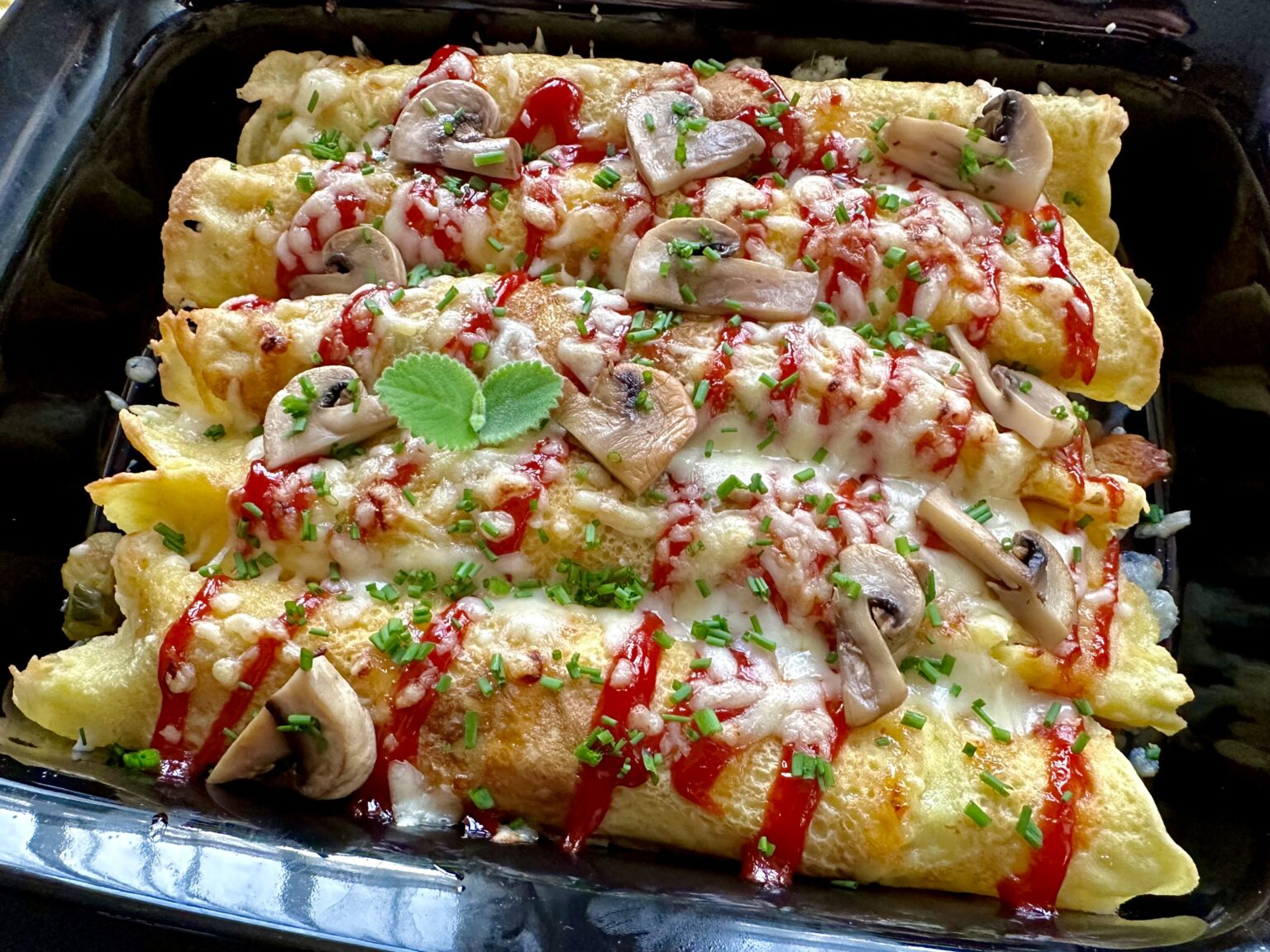 Naleśniki zapiekane z kindziukiem i pieczarkami